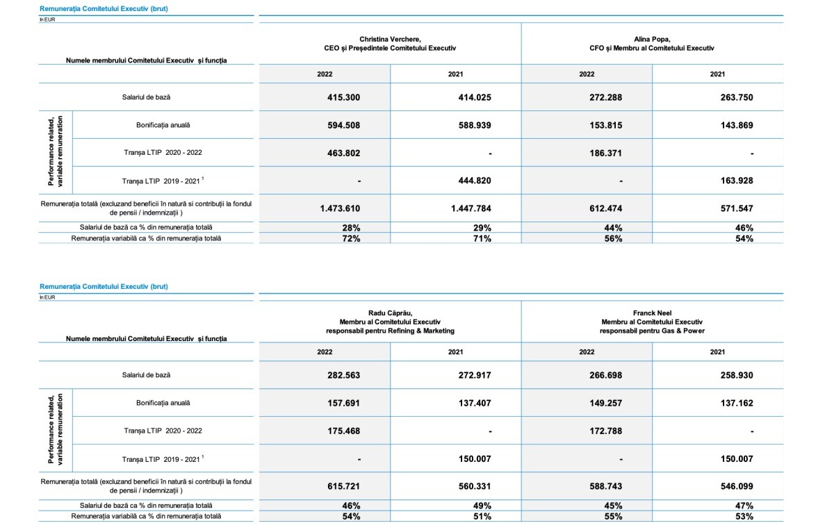 Christina Verchere, CEO și președintele directoratului, are salariu de bază de 415.000 de euro, bonus anual de 594.508, la care se adaugă tranşa planului de stimulare pe termen lung (LTIP), care include şi acţiuni în perioada 2020-2022 de 463.802 de euro. Astfel în 2022, renumerația totală, la care se include și bonusul și din acțiuni, de 1 milion de euro, a ajuns la 1,48 milioane de euro.