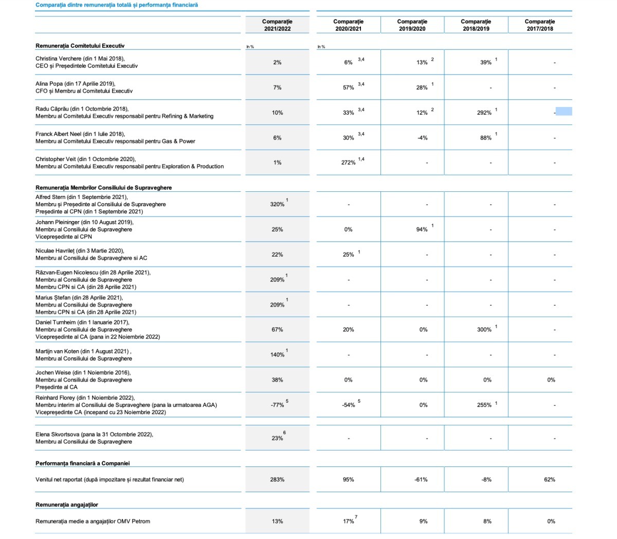 Având în vedere valorile finale de plată pentru LTIP 2019 și, prin urmare, remunerația totală rezultată pentru 2021 pe baza prețului actualizat al acțiunilor, așa cum s-a explicat mai sus, evoluția 2020/2021 pentru membrii Directoratului diferă ușor de cea raportată în raportul de remunerare 2021. Același lucru se va întâmpla și în cazul raportului de remunerare din anii următori și al evoluției 2021/2022”, se mai menționează în raportul OMV.