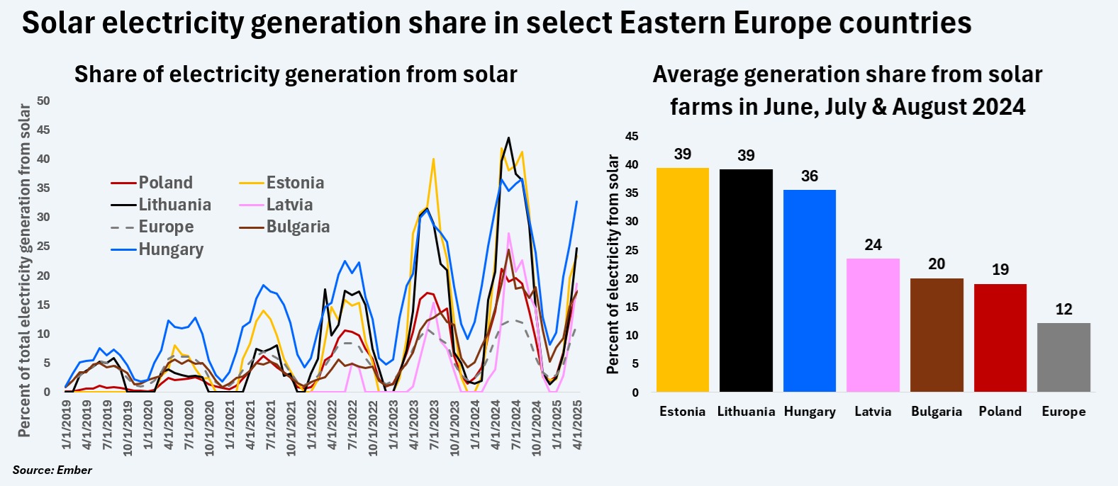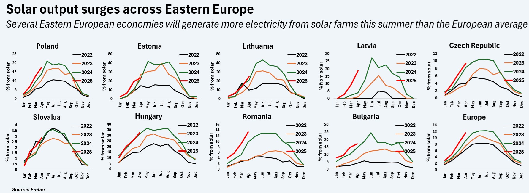 În multe dintre aceste țări, creșterea rapidă a energiei solare înlocuiește sau reduce producția centralelor electrice pe cărbune și gaze naturale și duce la o scădere mai accentuată a emisiilor din sectorul energetic în Europa de Est decât în întregul continent.
