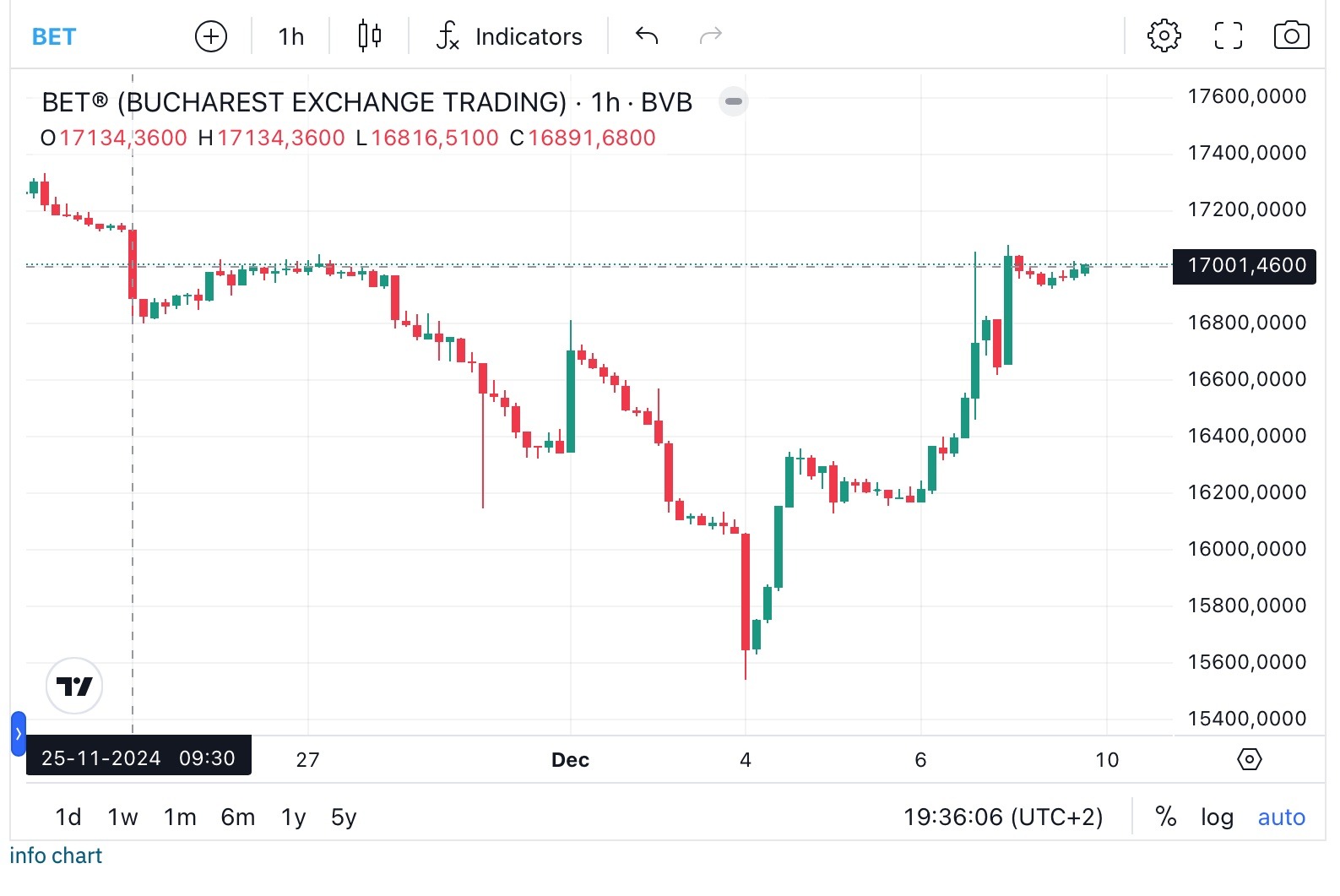 Principalul indice al Bursei de Valori Bucureşti, BET, care include cele mai tranzacţionate 20 de companii listate pe Piaţa Reglementată, s-a apreciat cu 2,16%, până la 17.010,32 puncte, nivel apropiat de cel de la deschiderea ședinței din 25 noiembrie, după primul tur al alegerilor prezidențiale.