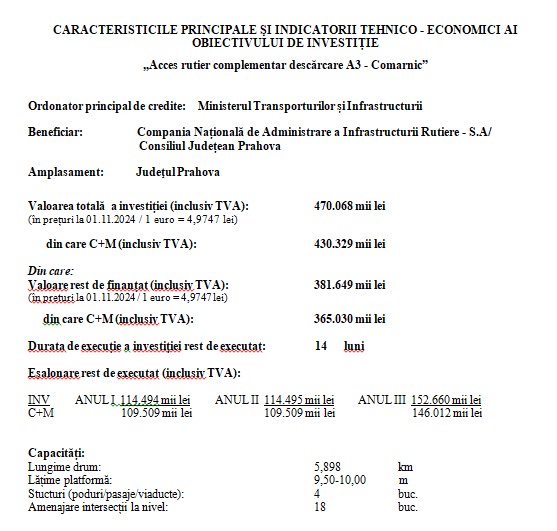 „Recent, proiectul a primit avizele finale necesare pentru avansarea lucrărilor, printre care aprobarea Comisiei Tehnico-Economice a CNAIR pentru proiectul tehnic de execuţie şi revizuirea studiului de fezabilitate, avizul Comisiei Tehnico-Economice Centrale a DEER pentru aspectele ce ţin de reţeaua electrică, precum şi avizul OCPI privind noul coridor de expropriere, necesar pentru consolidarea versanţilor adiacenţi traseului. Aceste ultime două avize au fost transmise către CNAIR în vederea obţinerii unei noi Hotărâri de Guvern care să includă modificările necesare traseului centurii, asigurând astfel derularea fără obstacole a proiectului”, anunţa, în februarie 2025, Consiliul Judeţean Prahova, instituţie care coordonează realizarea centurii ocolitoare a Comarnicului.