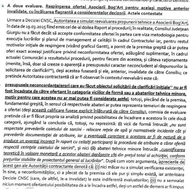 În a doua contestație depusă, Asocierea Bog Art –Trace a solicitat anularea raportului procedurii CJ Giurgiu și obligarea Autorității Contractante la respectarea deciziei CNSC din noiembrie 2024, pentru reevaluarea ofertei: