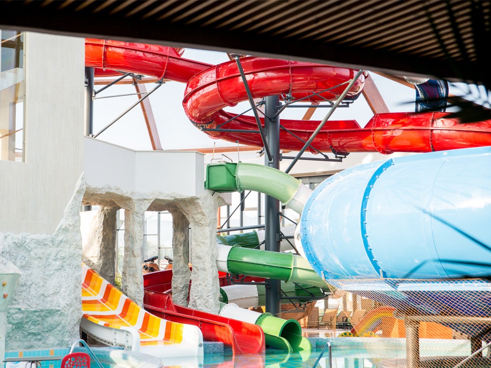 Complexul are piscine interioare, exterioare, zone de joacă pentru copii, tobogane colorate, zone de relaxare.