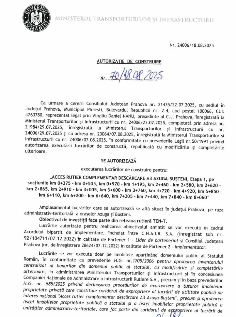 Consiliul Județean Prahova a emis prima autorizație de construire pentru Centura Bușteni – Azuga, a anunțat marți președintele instituției, Virgiliu Daniel Nanu.