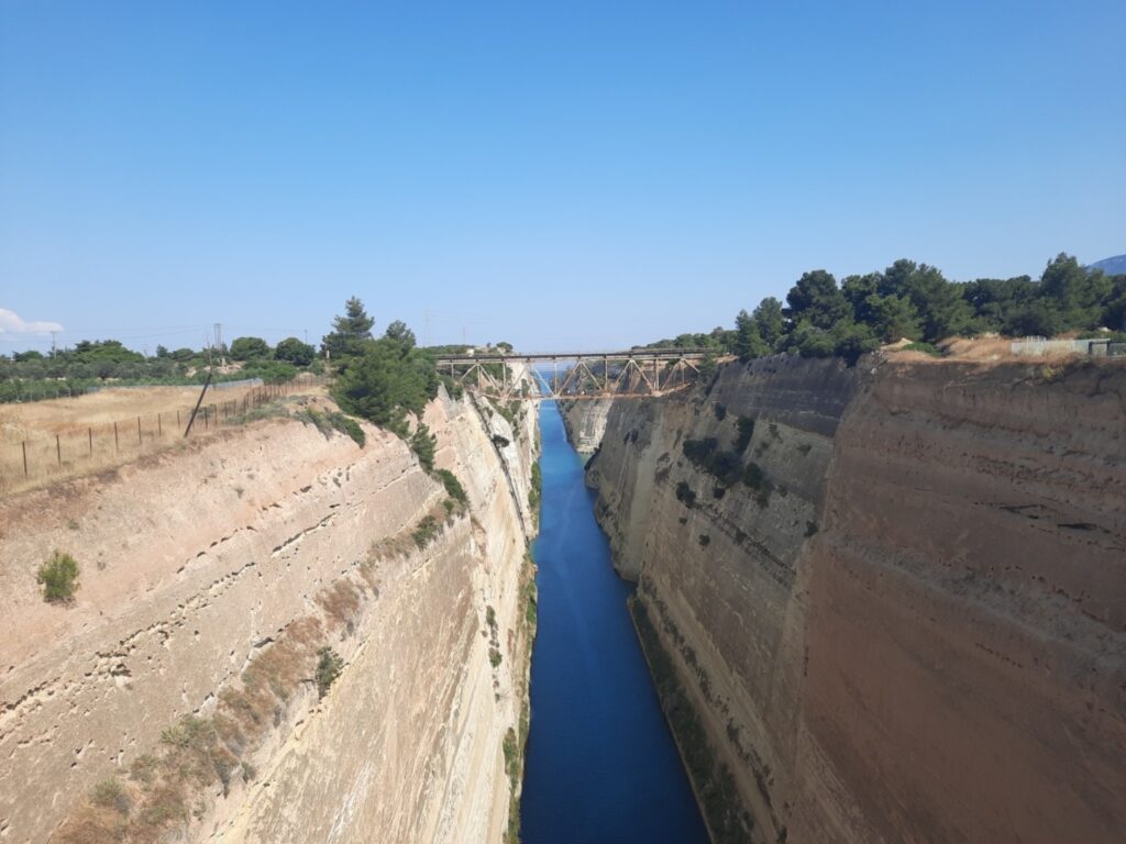Înainte de aceste trei puncte turul face o oprire la Canalul Corint, lung de șase kilometri, care leagă Golful Saronic (de la Marea Egee) de Golful Corint (de la Marea Ioniană), despărțind peninsula Peloponez de Grecia continentală. Încercări de a construi canalul au fost făcute în antichitate, dar acesta nu a fost săpat și dat în funcțiune decât în 1893 și nu poate fi navigat decât de nave de mici dimensiuni. Vederea de pe podul peste canal este însă extrem de spectaculoasă.