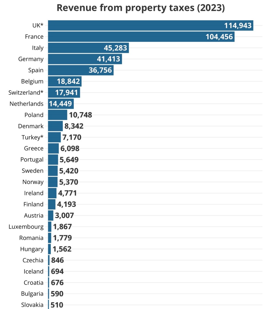 Marea Britanie a colectat cele mai mari venituri din impozitele pe proprietate în 2023, în valoare de 115 miliarde de euro (100 miliarde de lire sterline), urmată de Franța, cu 104,5 miliarde de euro. Aceste două țări domină veniturile din impozitele pe proprietate, Italia ocupând locul al treilea, cu doar 45,3 miliarde de euro.