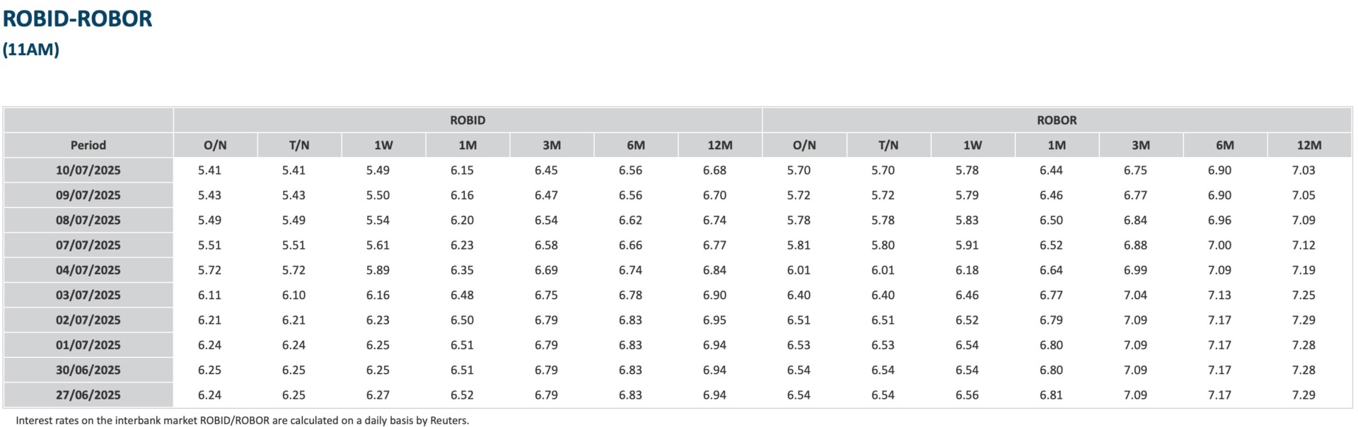 Indicele la şase luni, utilizat în calculul dobânzilor la creditele ipotecare în lei cu dobândă variabilă, a stagnat la 6,90% pe an, iar ROBOR la 12 luni a scăzut la 7,03%, de la 7,05%.