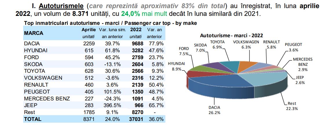 TOP 10 mărci, autoturisme + autovehicule comerciale, după patru luni din 2022, este condus de Dacia (9.832 unități), urmată de Ford (3.596 unități), Hyundai (3.282 unități), Renault (2.904 unități), Toyota (2.852 unități), Volkswagen (2.746 unități), Skoda (2.604 unități), Mercedes Benz (2.367 unități), Peugeot (1.512 unități) și Fiat (996 unități). Autoturismele (care reprezintă aproximativ 83% din total) au înregistrat, în luna aprilie 2022, un volum de 8.371 unități, cu 24,0% mai mult decât în luna similară din 2021.