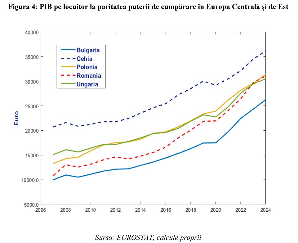 Pentru Europa Centrală și de Est, evoluțiile evidențiate în Figura 4 subliniază faptul că România a avut una dintre cele mai accelerate și mai susținute dinamici ale PIB pe locuitor din regiune. La momentul aderării la Uniunea Europeană, în ceea ce privește acest indicator, țara noastră se plasa la un nivel superior doar Bulgariei. Totodată, PIB-ul pe locuitor al Ungariei era superior celui al României și al Poloniei. Circa 18 ani mai târziu, în 2024, PIB-ul pe locuitor al României era foarte apropiat de cel al Poloniei și superior celui aferent Ungariei.