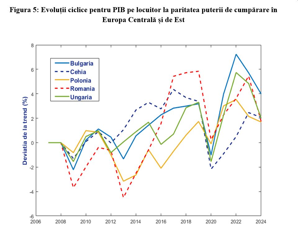 Pentru o imagine mai detaliată asupra procesului de convergență, în Figura 5 de mai jos, am raportat evoluțiile ciclice ale indicatorului PIB pe locuitor pentru întreaga regiune. Și de această dată, am utilizat varianta one-sided a filtrului Hodrick-Prescott, unde parametrul de netezire lambda a fost calibrat la valoarea 100, dată fiind frecvența anuală a datelor. Din evoluțiile prezentate, se observă faptul că seria ciclică obținută pentru țara noastră înregistrează variații mai ample, cu o magnitudine clar mai pronunțată în faza de expansiune.