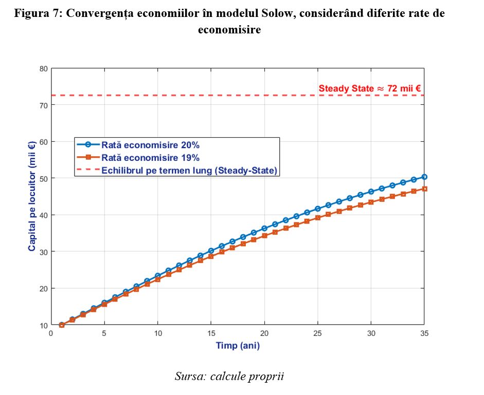 Astfel, am considerat două economii emergente, în care nivelul capitalului pe locuitor este de 5000 de euro, rata de depreciere a capitalului este de 5% pe an, în timp ce ponderea capitalului în venitul total din economie este 30%. Cele două economii se diferențiază doar marginal, prin ratele de economisire de 20%, respectiv 19%. Rezultatele prezentate în Figura 7 indică faptul că, după un interval de 15 ani, diferența dintre cele două economii în ceea ce privește capitalul pe locuitor începe să se amplifice. La finalul orizontului de 35 de ani, economia caracterizată printr-o rată de economisire doar ușor mai ridicată înregistrează un nivel al capitalului pe locuitor cu aproximativ 6,8% superior celeilalte.