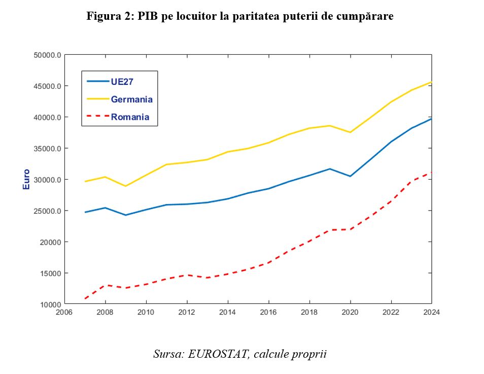 Privind retrospectiv, așa cum s-a subliniat adesea și cum am menționat și cu alte ocazii, de la momentul integrării în Uniunea Europeană și până în prezent, datele evidențiază un progres remarcabil pentru România în termeni de convergență reală. Produsul intern brut pe locuitor, exprimat la paritatea puterii de cumpărare, a crescut de la aproximativ 10.800 euro în 2007 la circa 31.000 euro în 2024 – o triplare în decurs de 17 ani. Am ales această măsură exprimată în PPS deoarece reflectă mai fidel puterea reală de cumpărare a populației, făcând posibilă o comparație relevantă cu alte state membre UE, indiferent de diferențele de prețuri și de costuri de trai. Totodată, în Figura 2, observăm faptul că măsura PIB pe locuitor din Germania și Uniunea Europeană evoluează foarte asemănător în termeni de tendință.
