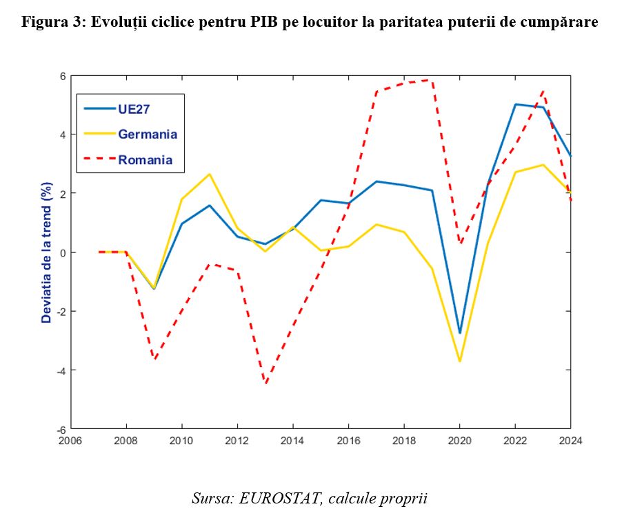 Pentru a obține o imagine mai clară asupra decuplării factorilor comuni resimțiți la nivel european și a celor specifici României, am extras și am prezentat în graficul de mai jos componenta ciclică din seriile cu privire la PIB pe locuitor. Pentru aceasta, am utilizat varianta one-sided a filtrului Hodrick-Prescott, unde parametrul de netezire lambda a fost calibrat la valoarea 100, în concordanță cu frecvența anuală a datelor.