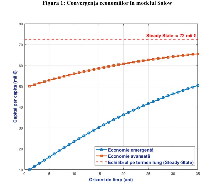 Pentru a reda cât mai bine procesul de convergență am recurs la parametrizarea modelului Solow pentru cazul unei economii avansate, respectiv al unei economii emergente aflate într-un proces de convergență. În cadrul acestui exercițiu contrafactual cantitativ am considerat o calibrare relativ standard, unde rata de depreciere a capitalului este de 5% pe an, rata de economisire este de 20%, în timp ce ponderea capitalului în venitul total din economie este 30%. În cadrul exercițiului, cele două tipuri de economii se deosebesc prin nivelul inițial al capitalului pe locuitor. Astfel, pentru economia emergentă am considerat un nivel al capitalului pe locuitor de 5 mii de euro, în timp ce pentru economia avansată, nivelul capitalului pe locuitor a fost calibrat la 10 mii de euro. Întrucât rata de depreciere a capitalului, rata de economisire, respectiv ponderea capitalului în venitul total din economie sunt aceleași pentru ambele tipuri de economii, rezultă un nivel de echilibru pe termen lung al capitalului pe locuitor de 72 mii de euro. Pentru analiza de față am considerat un orizont de timp de 35 de ani.