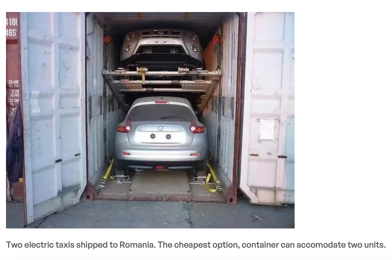 La secțiunea de prezentare a platformei există o referire și la expedierea a două mașini în România. “Două taxiuri electrice expediate în România. Opțiunea cea mai ieftină, containerul poate transporta două unități.”, scrie lângă fotografia cu mașinile.