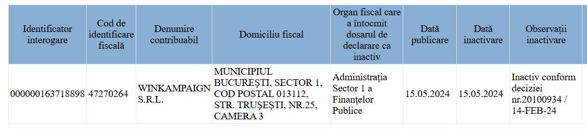 Și această firmă apare în baza de date ANAF ca fiind inactivă: