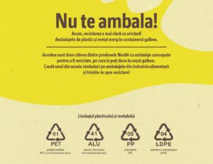 Prin urmare, Nestlé România s-a implicat activ în promovarea colectării selective prin campanii de informare și educare a consumatorilor, colaborări cu autorități, ONG-uri și parteneri din industrie, dar și investește activ în soluții de ambalare care să fie mai prietenoase cu mediul. Nestlé Institute of Packaging Sciences din Elveția rămâne un punct de referință în R&D pentru dezvoltarea de soluții optime în domeniul sustenabilității ambalajelor.