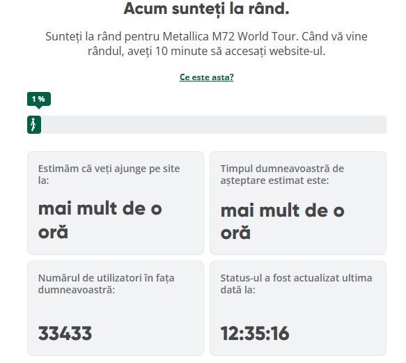 Peste 30.000 de mii de oameni stăteau la coadă, marți, la prânz, pentru a cumpăra bilete la concertul Metallica de anul viitor, din 13 mai 2026. Aplicația George a BCR funcționează cu intermitențe.