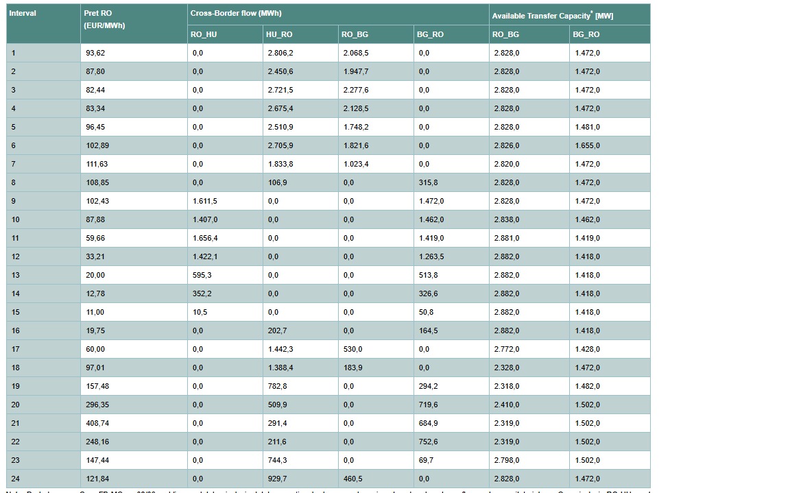 Pe intervalul de după prânz cu cele mai mici prețuri suntem net exportatori pe relația cu Ungaria, trimițând peste graniță peste 300 MW. Pe seară se inversează trendul, suntem net importatori, atât din Ungaria cât și din Bulgaria, și aducem circa 1.000 MW.