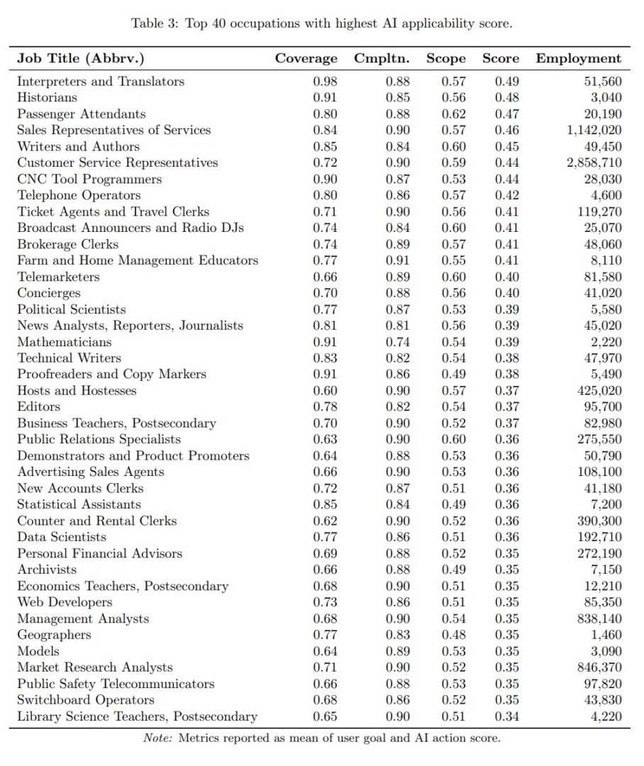 Apoi au combinat aceste date cu informații despre ocupațiile care includ aceste sarcini de lucru, calculând un „scor de aplicabilitate a IA”, care măsoară probabilitatea ca un loc de muncă să fie afectat de IA.