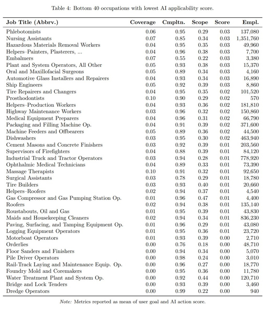 Pe de altă parte, locurile de muncă cu cele mai scăzute scoruri de aplicabilitate implicau muncă fizică, lucrul direct cu oamenii sau operarea de mașini.